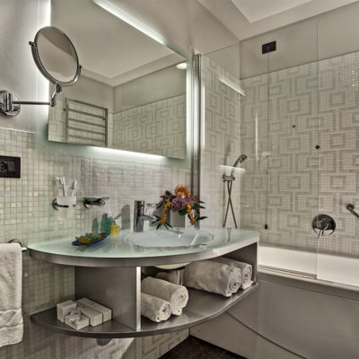 Impreziosisce il tutto un ricco set cortesia con morbidi accappatoi personalizzati e frutta fresca di benvenuto.