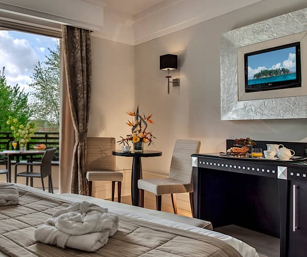 The Deluxe Room offers comfort and sophistication, with inviting spaces and tasteful details inspired by classic or contemporary Venetian design. Enjoy a terrace with park views and a bathroom with elegant mosaics and a spacious bath or shower, turning your stay into a moment of genuine relaxation.